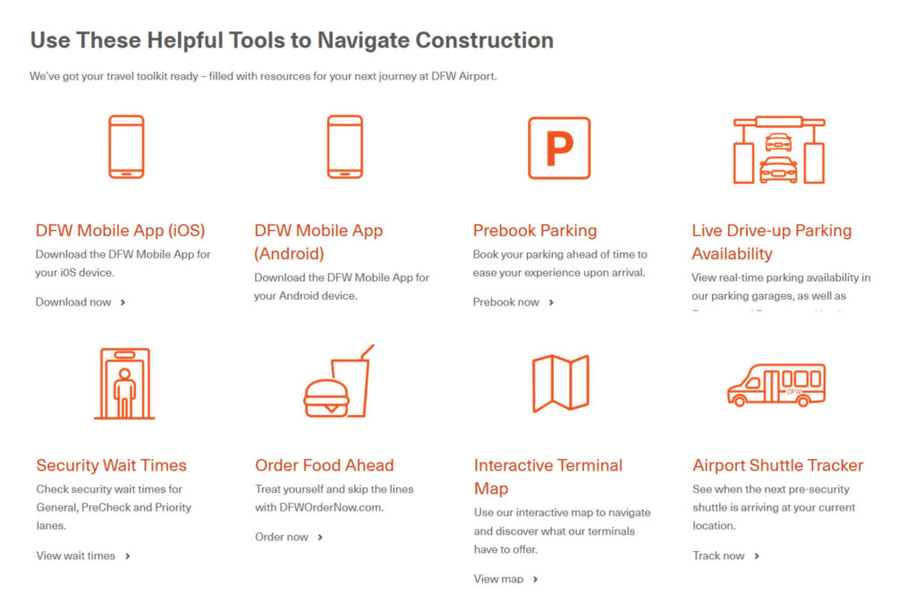 • Download the DFW Airport mobile app: Available for iOS and Android, the DFW Airport mobile app is available to assist travelers along every step of their airport journey with access to helpful tools, including prebook parkinglive parking availabilitysecurity wait times and construction updates.